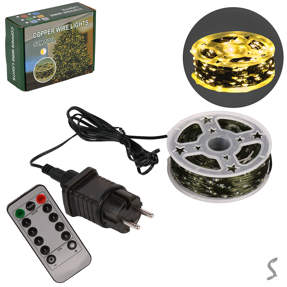 Гирлянда светодиодная желтая "Роса" белая проволока на пульте 50м 500led, от сети, в кор.13*11*4,5см (50шт)