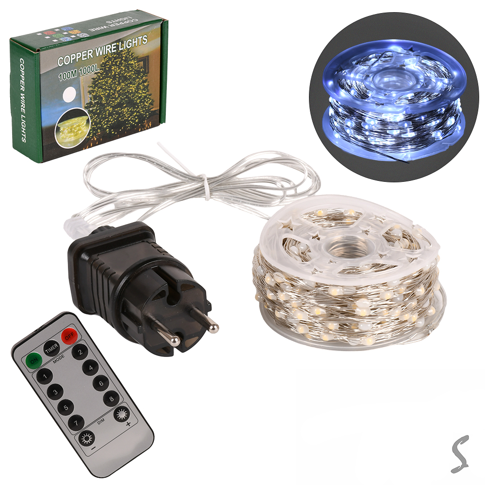 Гирлянда светодиодная белая Роса белая проволока на пульте 100м 1000led, от сети, в кор.15,5*11*5см (30шт)