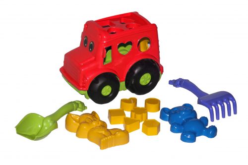 Сортер-машина "Автошка" №3, вкладышами, лопатка и грабельки, три бол. пасочки, сетка 20*15*15см, Украина, ТМ Колорпласт (18шт)
