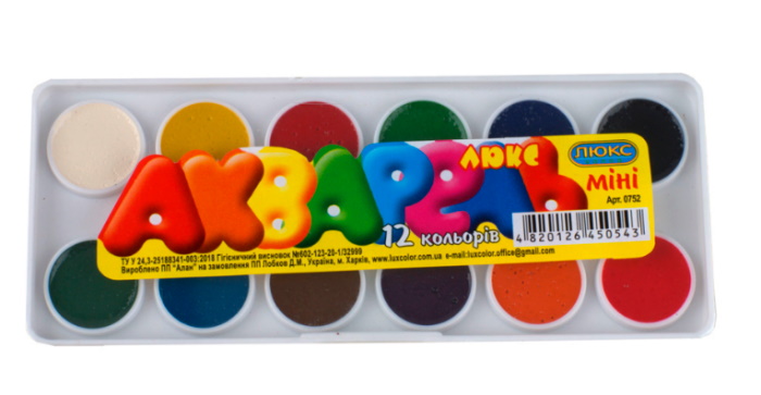Фарба акварельна MINI 12 кольорів, пласт. кор. "ЛЮКС КОЛОР"