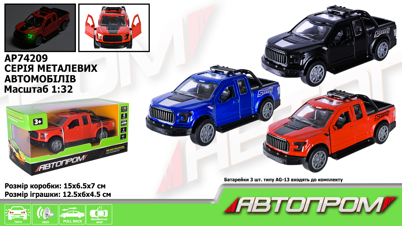 Машина мет. АВТОПРОМ 1:32, 3 кольори, відкр.двері, бат.,світ., звук, в кор. 15*6,5*7см (48шт)