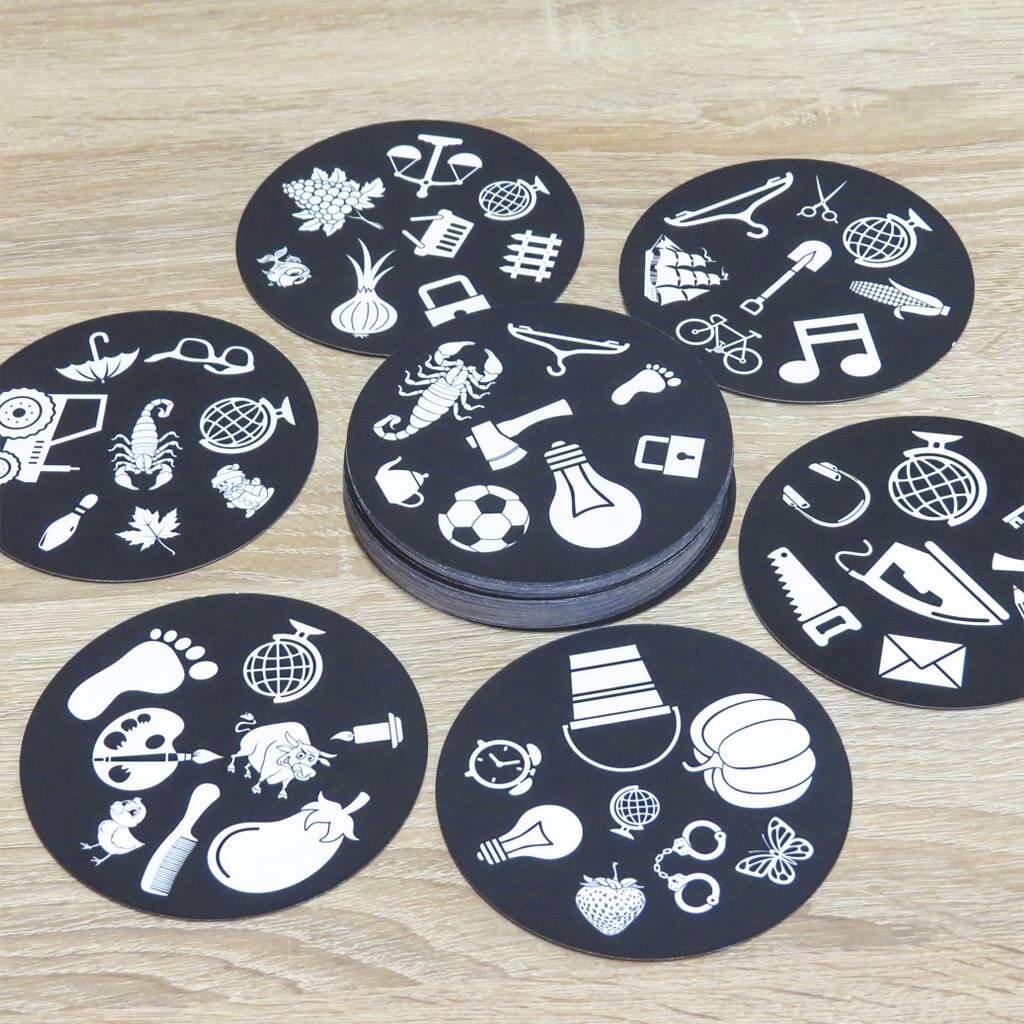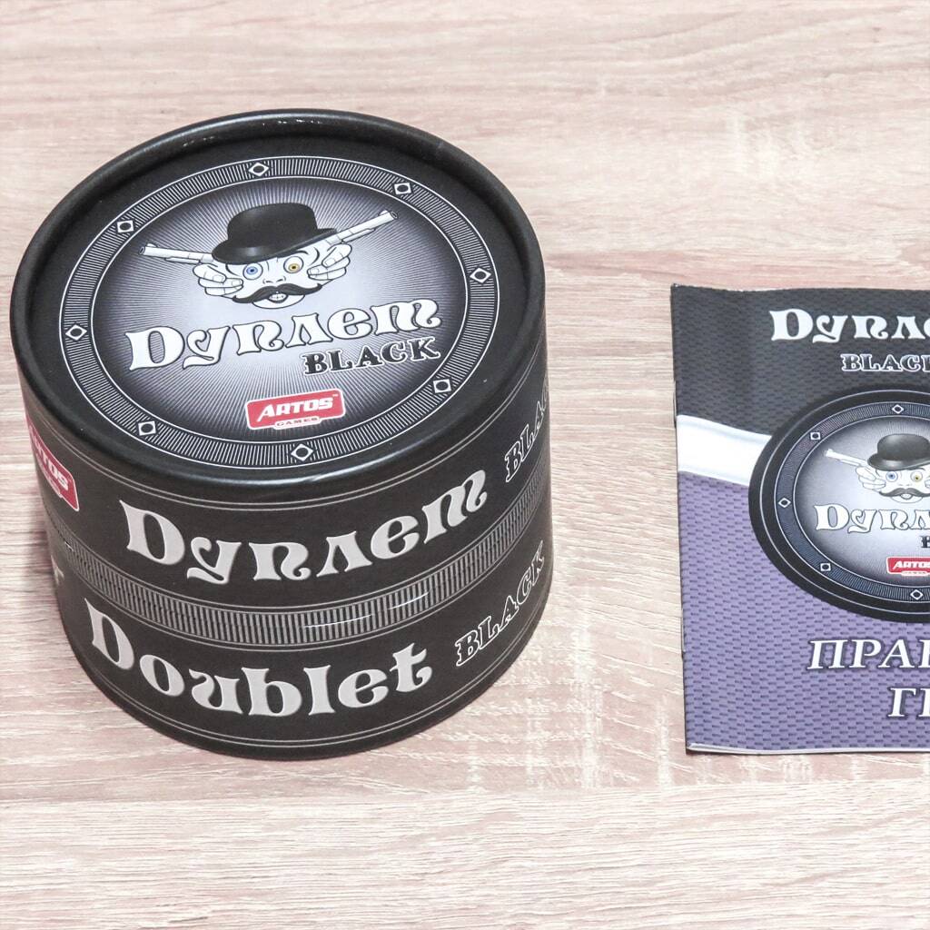 «ДУПЛЕТ Black» - весела динамічна гра, що розвиває зорове сприйняття, увагу і концентрацію. Ця гра відмінно підійде як діткам, так і дорослим. Для гри використовується колода з 57 круглих карток з безліччю зображень. Кожна картка унікальна. На ній розміщені 8 картинок, але тільки одна з них збігається із зображенням на будь-який інший картці з колоди.Мета гри: ігровий процес побудований на пошуку збігів. Гравець повинен першим знайти зображення, що збігається на обох картках. Далі йому необхідно озвучити дане зображення, а потім взяти або скинути відповідну карту (в залежності від варіанту гри).