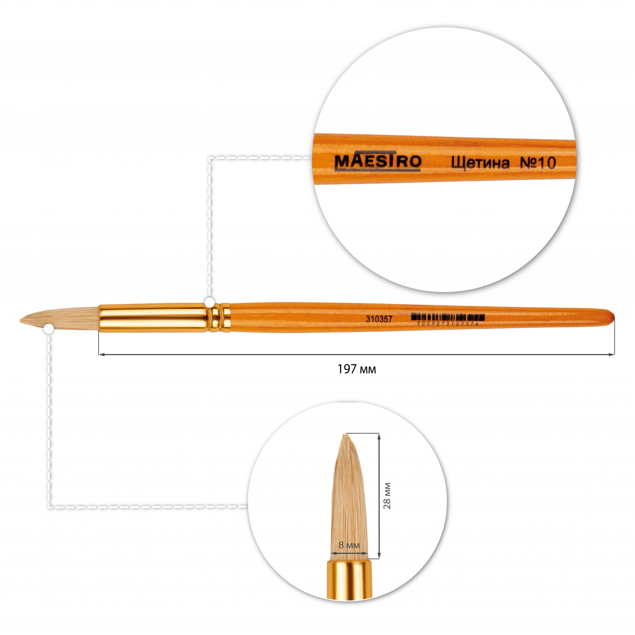 Пензель художній «Maestro» щетина, круглий №10, 22см – це незамінний інструмент для художньої творчості, ідеальний для роботи з насиченими фарбами та створення виразних мазків.Він призначений для використання з олійними, акриловими та темперними фарбами. Кругла форма пензля дозволяє легко малювати широкі та детальні лінії, а щетина забезпечує контроль над фарбою та виразність мазків.Перевага пензля – у його міцності та довговічності: дерев’яна ручка зручна в руці, алюмінієва гільза надійно утримує ворс, а щетина зберігає форму навіть при активному використанні. Для тривалого служіння рекомендується ретельно промивати пензель після роботи та зберігати ворсом догори.