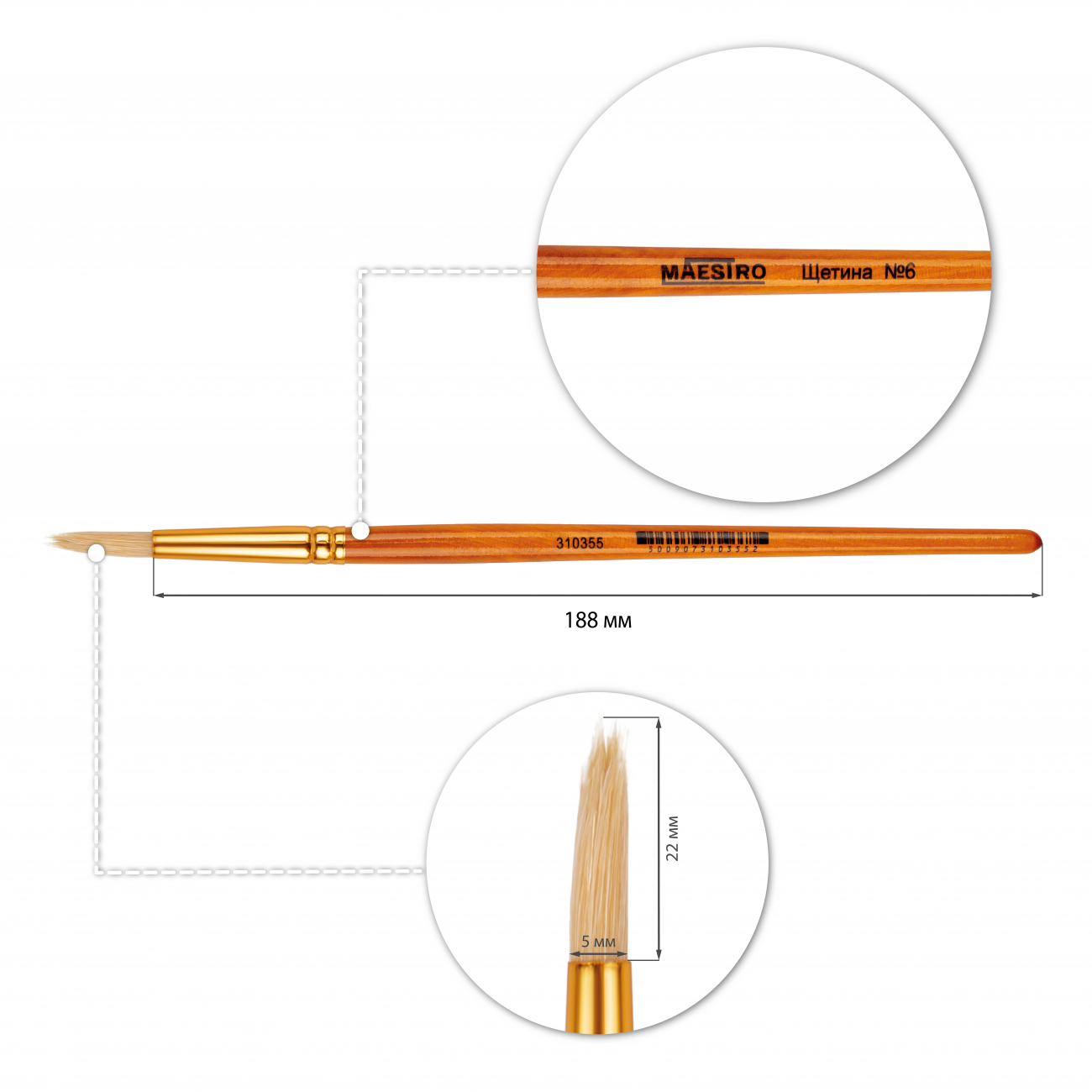 Пензель художній «Maestro» щетина, круглий №6, 21см – це міцний та надійний інструмент для художньої творчості, який дозволяє створювати чіткі та виразні мазки.Він призначений для роботи з олійними, акриловими та темперними фарбами. Кругла форма пензля забезпечує точність у малюванні ліній та деталей, а щетина дозволяє передавати насиченість фарби й інтенсивність мазків.Перевага пензля – у його довговічності та зручності: дерев’яна ручка комфортно лежить у руці, алюмінієва гільза надійно утримує ворс, а щетина зберігає форму навіть при активному використанні. Для тривалого служіння рекомендується ретельно промивати пензель після роботи та зберігати ворсом догори.