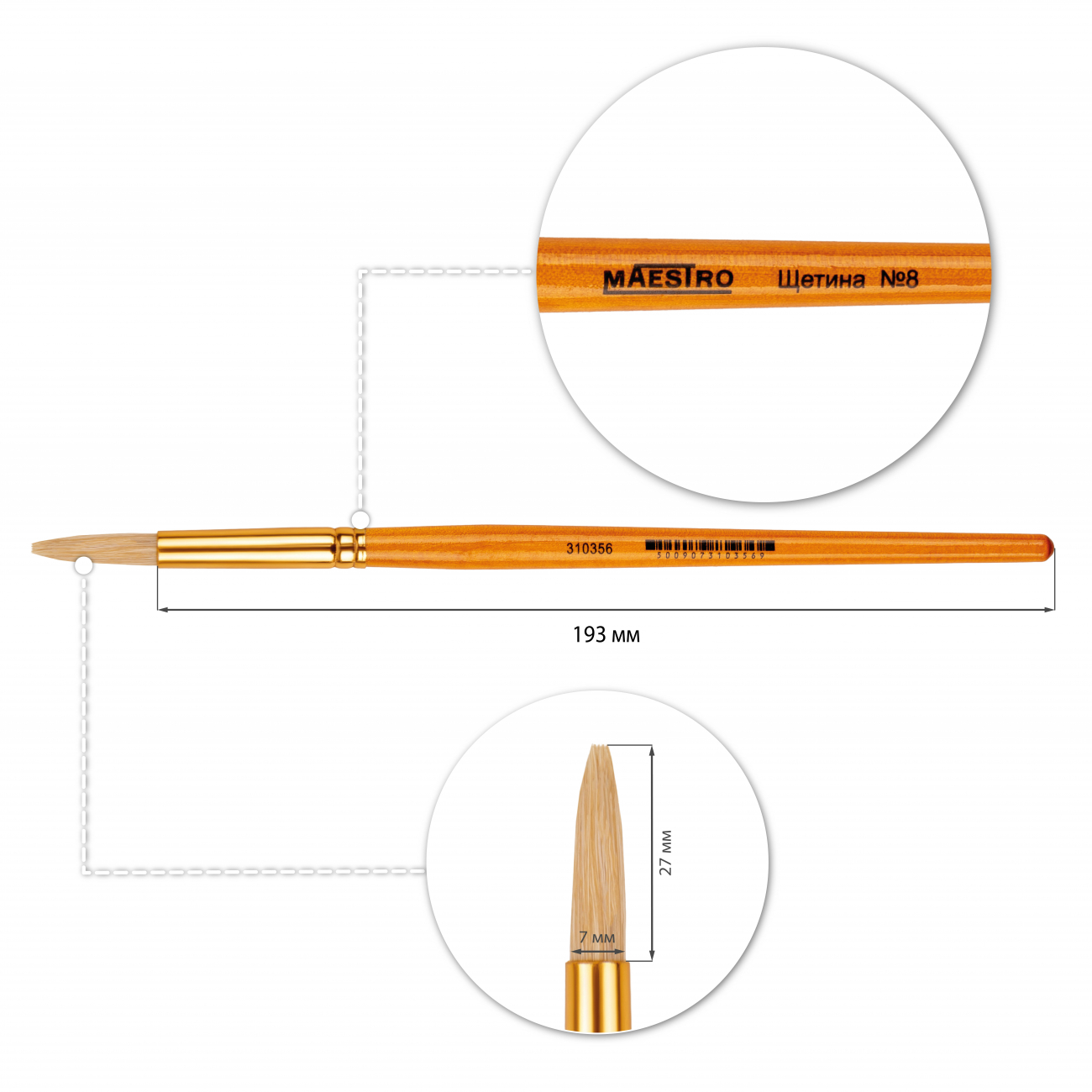 Пензель художній «Maestro» щетина, круглий №8, 22см (ТМ 1 Вересня) – це надійний інструмент для художньої творчості, який дозволяє створювати виразні та насичені мазки.Він призначений для роботи з олійними, акриловими та темперними фарбами. Кругла форма пензля забезпечує контроль над фарбою та точність у нанесенні мазків, а щетина дозволяє рівномірно передавати насиченість кольору на полотно.Перевага пензля – у його довговічності та зручності: дерев’яна ручка комфортно лежить у руці, алюмінієва гільза надійно утримує ворс, а щетина зберігає форму навіть при активному використанні. Для тривалого служіння рекомендується промивати пензель теплою водою після роботи та зберігати ворсом догори.