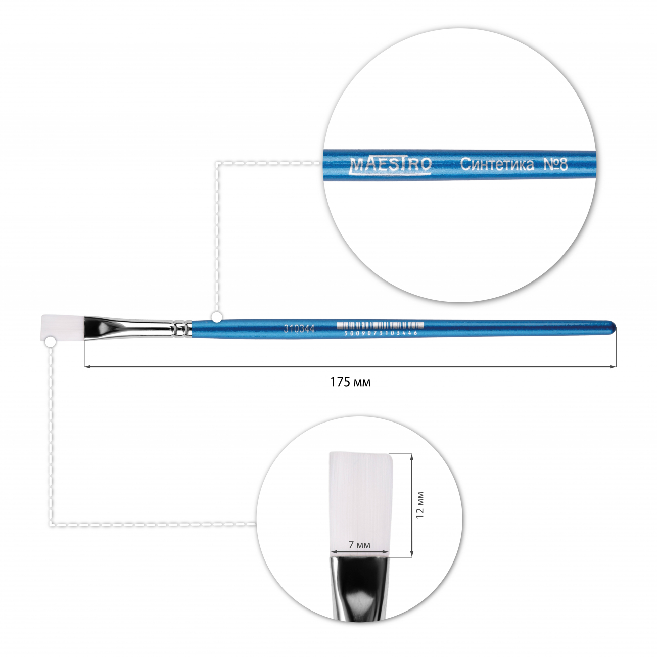 Пензель художній «Maestro» синтетика, плоский №8, 18см – це надійний інструмент для художньої творчості, ідеальний для нанесення широких мазків та рівномірного покриття великих поверхонь.Він призначений для роботи з олійними, акриловими та темперними фарбами. Плоска форма пензля дозволяє швидко та рівномірно заповнювати площини, створюючи гладкі та насичені кольори. Синтетичний ворс добре утримує фарбу та забезпечує рівномірний розподіл на полотні.Перевага пензля – у його зручності та довговічності: дерев’яна ручка приємна в руці, алюмінієва гільза надійно тримає ворс, а синтетичний матеріал зберігає форму навіть після багаторазового використання. Для тривалого служіння рекомендується промивати пензель теплою водою після роботи та зберігати ворсом догори.