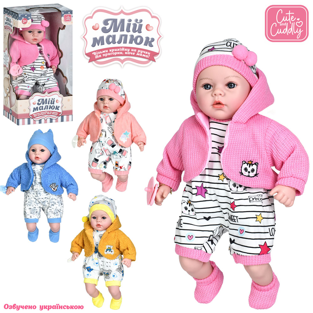 Пупс 45см, м'яконабивний, 4 види, музика/звук (укр), вірш, пісня, 4 види, бат(табл), в кор. 23*43*16см (18шт)