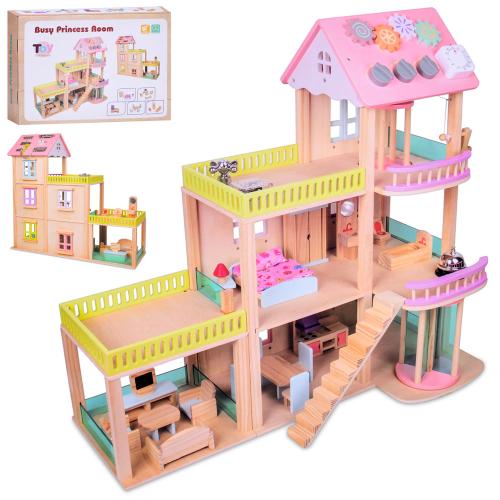 Дерев'яна іграшка Будиночок 3 поверхи, меблі, дах (шестерні, перемикачі), ліфт, дзвінок, музика(заводна), в кор. 61*44*15см (1шт)
