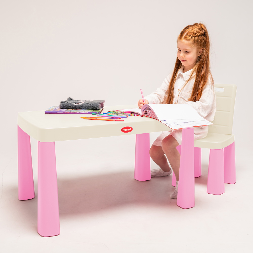 Практичний комплект від Doloni складається з дитячого столу та двох стільців із пластику. Особливість цих стільців у тому, що їх можна легко перетворити на табурети: спинка знімається повністю, а замість неї встановлюється заглушка, яка входить у набір. Така універсальність дозволяє використовувати меблі по-різному — для ігор, занять творчістю чи чаювання.Головна перевага продукції Doloni — її міцність. Стільці витримують вагу дорослої людини, адже виготовлені з первинного, сертифікованого та безпечного пластику, стійкого до ударів і подряпин. Завдяки цьому меблі довговічні й підходять для щоденного використання як у приміщенні, так і на вулиці.Стіл має висоту 48 см, довжину 82 см та ширину 56 см, а розміри кожного стільця становлять 30*30см при висоті 60 см. Такі параметри роблять набір зручним для дітей різного віку й дозволяють комфортно займатися малюванням, конструктором або спільними іграми.