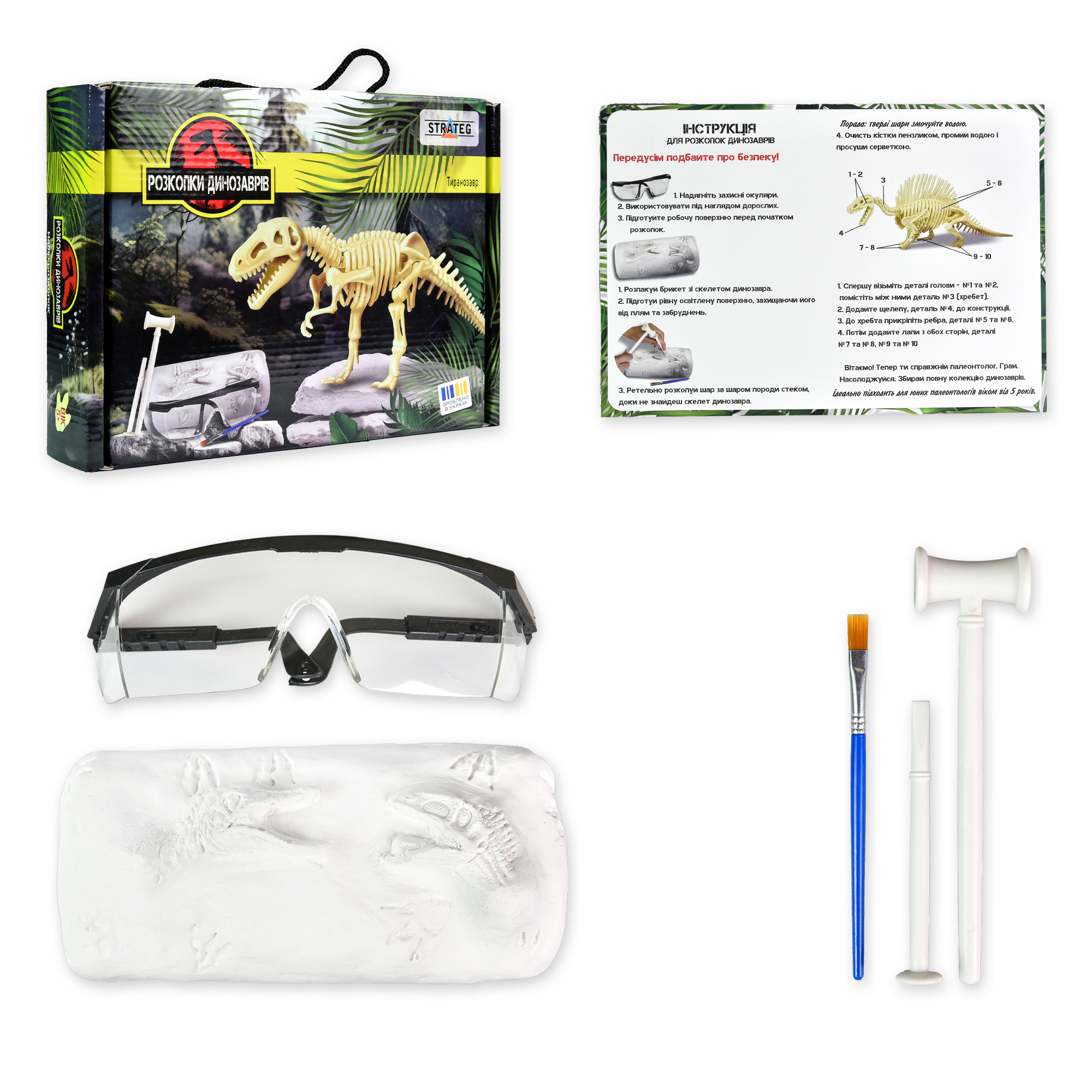 Набір для творчості «Розкопки динозавра. Тиранозавр» – справжня археологічна пригода для дітей від 5 років! Усередині гіпсового брикета схований скелет динозавра, який дитина знайде за допомогою інструментів і захисних окулярів. Розкрий таємниці давніх скам’янілостей і відчуй себе юним дослідником!Комплектація: коробка, гіпсовий брикет, інструменти, захисні окуляри, інструкція.