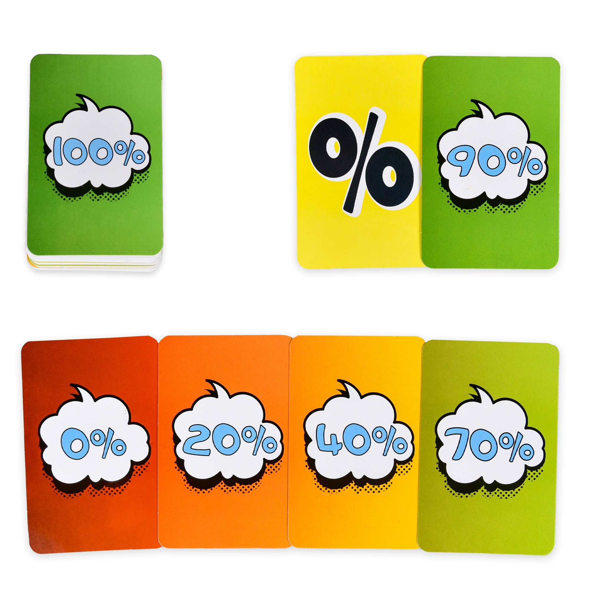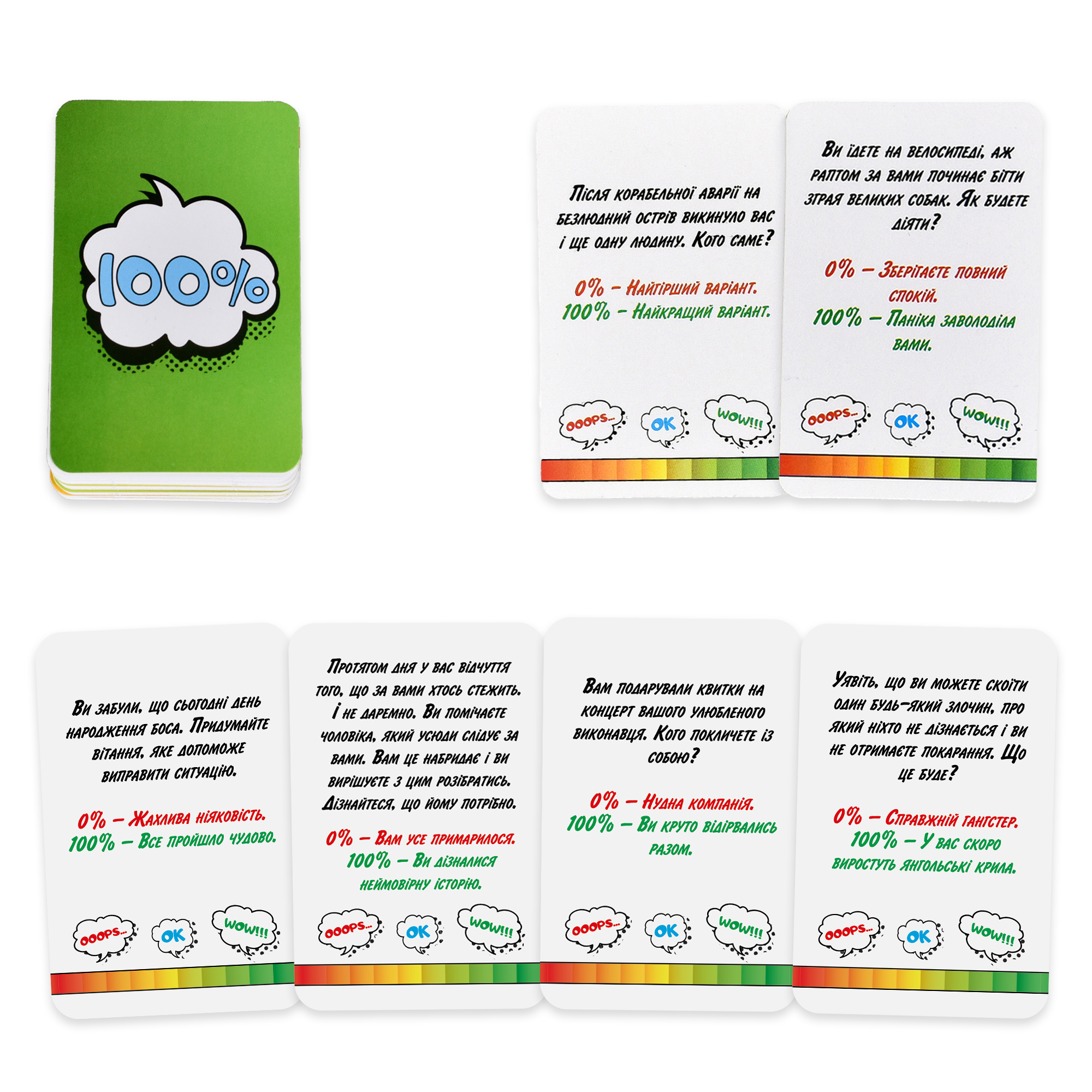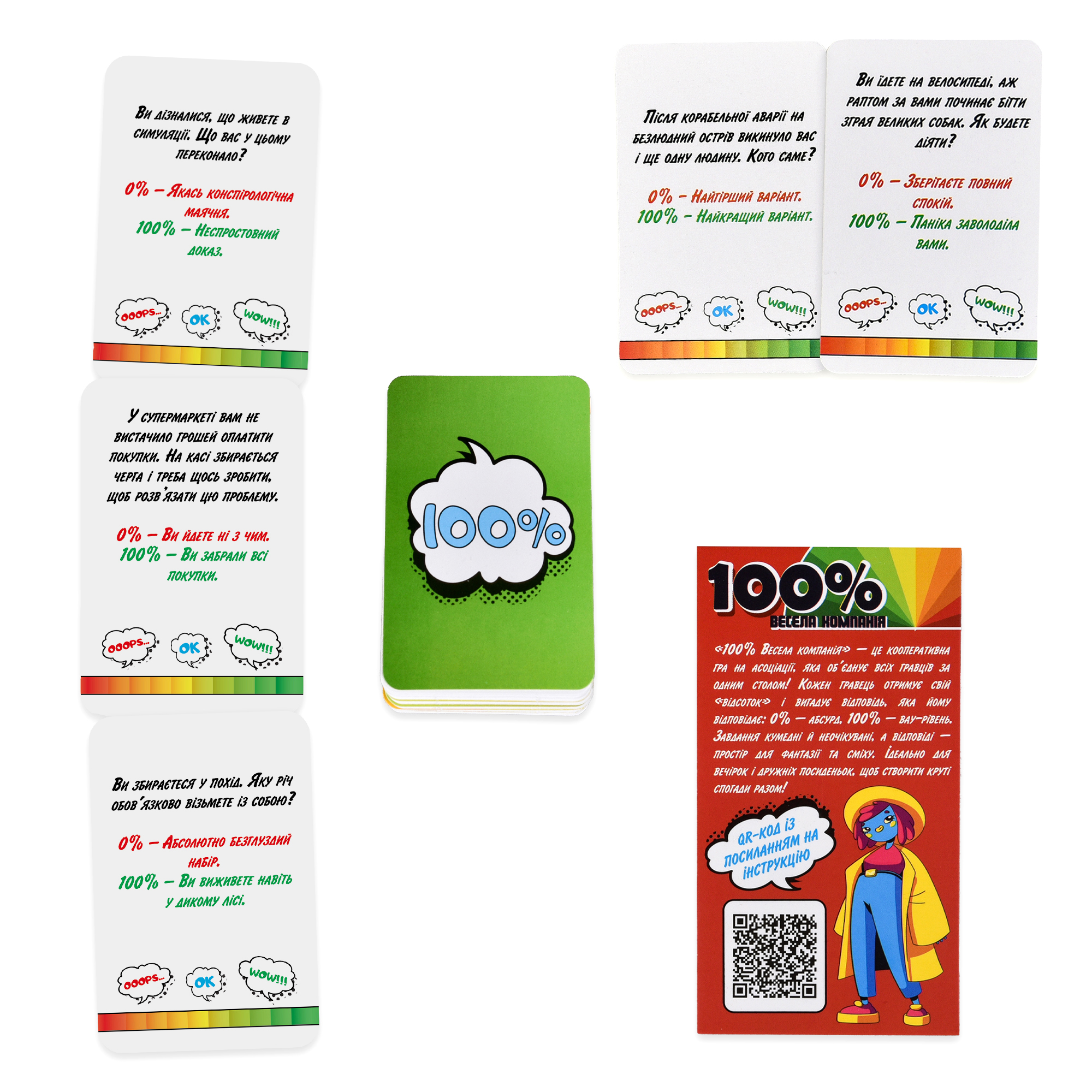 Настільна гра «100% Весела компанія» — кооперативна гра для компанії, де перемога залежить від того, наскільки добре ви розумієте одне одного.У кожному раунді гравці отримують картки з відсотками від «0%» до «100%». Ведучий зачитує питання, а гравці придумують відповіді, які відповідають їхнім карткам. Потім всі відповіді озвучуються, і завдання гравців — розкласти картки за зростанням, не знаючи відсотків інших.Ця гра гарантовано викликає сміх і допомагає дізнатися про справжні вподобання друзів: хто на 90% любить холодець, а хто на 10% — десерт.Вік: 10+. Кількість гравців: 2–8. Час гри: 15 хв. Комплектація: 110 карток, картка з QR-кодом.