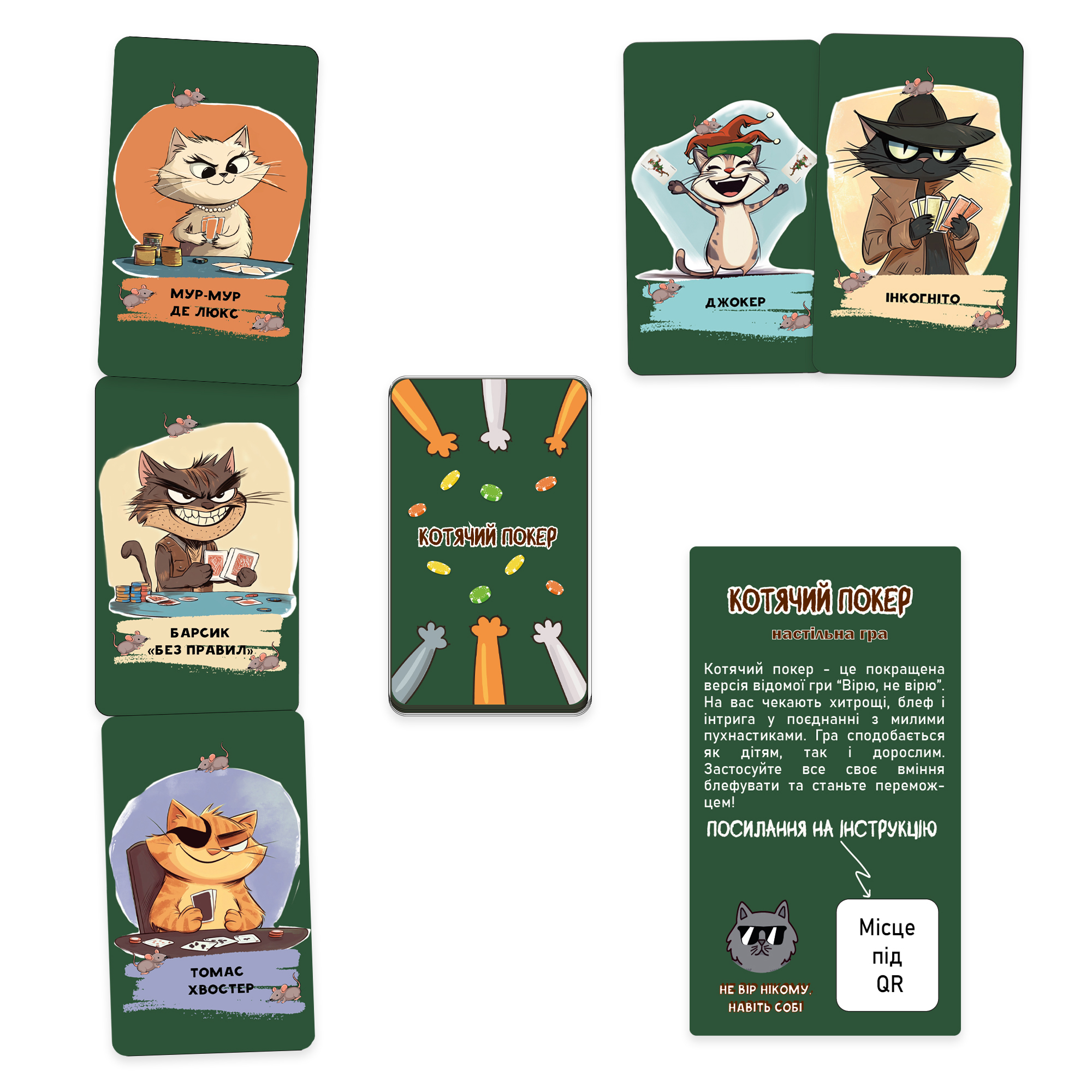 Настільна гра «Котячий покер» — це гра, де блеф і котяча хитрість ідуть лапа в лапу! Весела, динамічна та непередбачувана розвага для дітей і дорослих, створена за мотивами гри «Вірю — не вірю», але з пухнастим характером.Гравці по черзі викладають карти з котами й переконують інших у їхній «чесності». Можна повірити, можна сумніватися — але будь уважним, бо помилка коштуватиме тобі цілої лапатої купи карток!Сміх, азарт і море емоцій гарантовані. У цій грі переможе той, хто майстерно бреше з найщирішим котячим поглядом!Вік: від 8 років. Кількість гравців: 2–6.