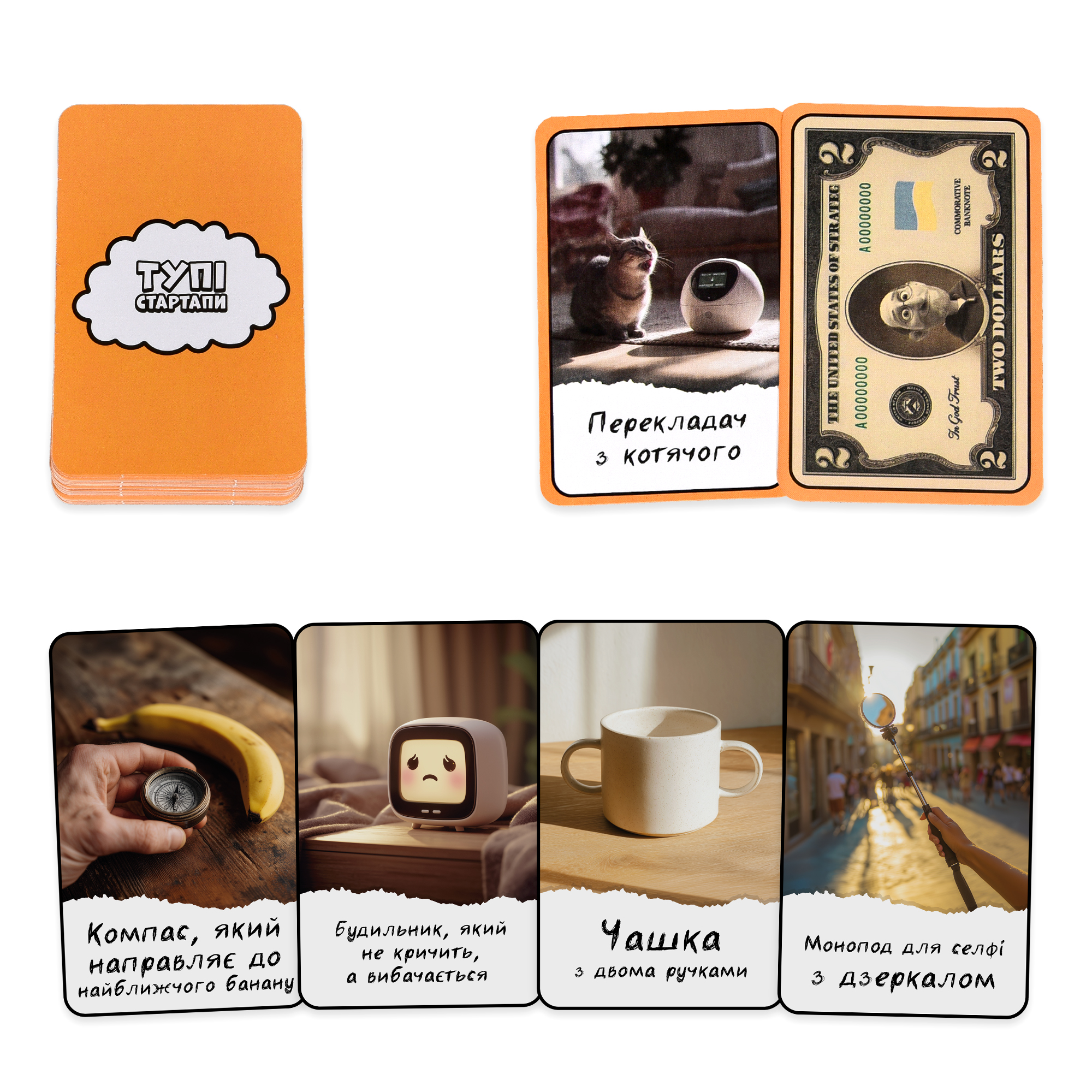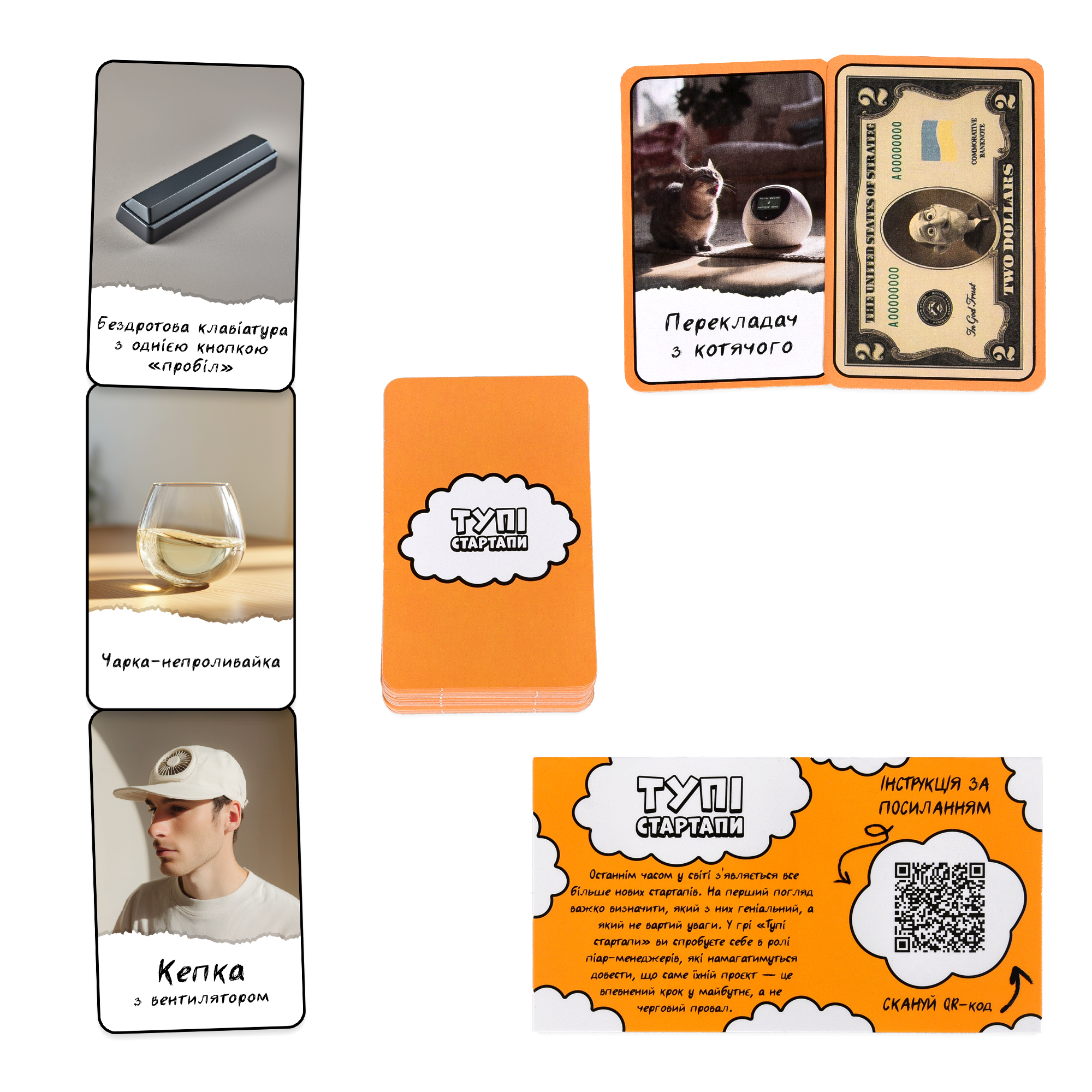 Настільна гра «Тупі Стартапи» — це вибух сміху та креативу для компанії друзів або колег! Уявіть, що вам доводиться презентувати стартап, який на перший погляд абсолютно безглуздий. Саме таку ідею ви отримаєте, витягнувши одну з 110 карток гри.Ваша задача — знайти переваги там, де їх ніхто не бачить, переконати інших у геніальності своєї абсурдної ідеї і, можливо, стати «мільярдером» серед друзів. Гра гарантує море сміху, шалені дискусії та креативні рішення.Ідеально для дружніх вечірок, корпоративів або просто веселого часу з компанією.Вік: 16+. Кількість гравців: 3+.Комплектація: 110 карток, картка з QR-кодом.