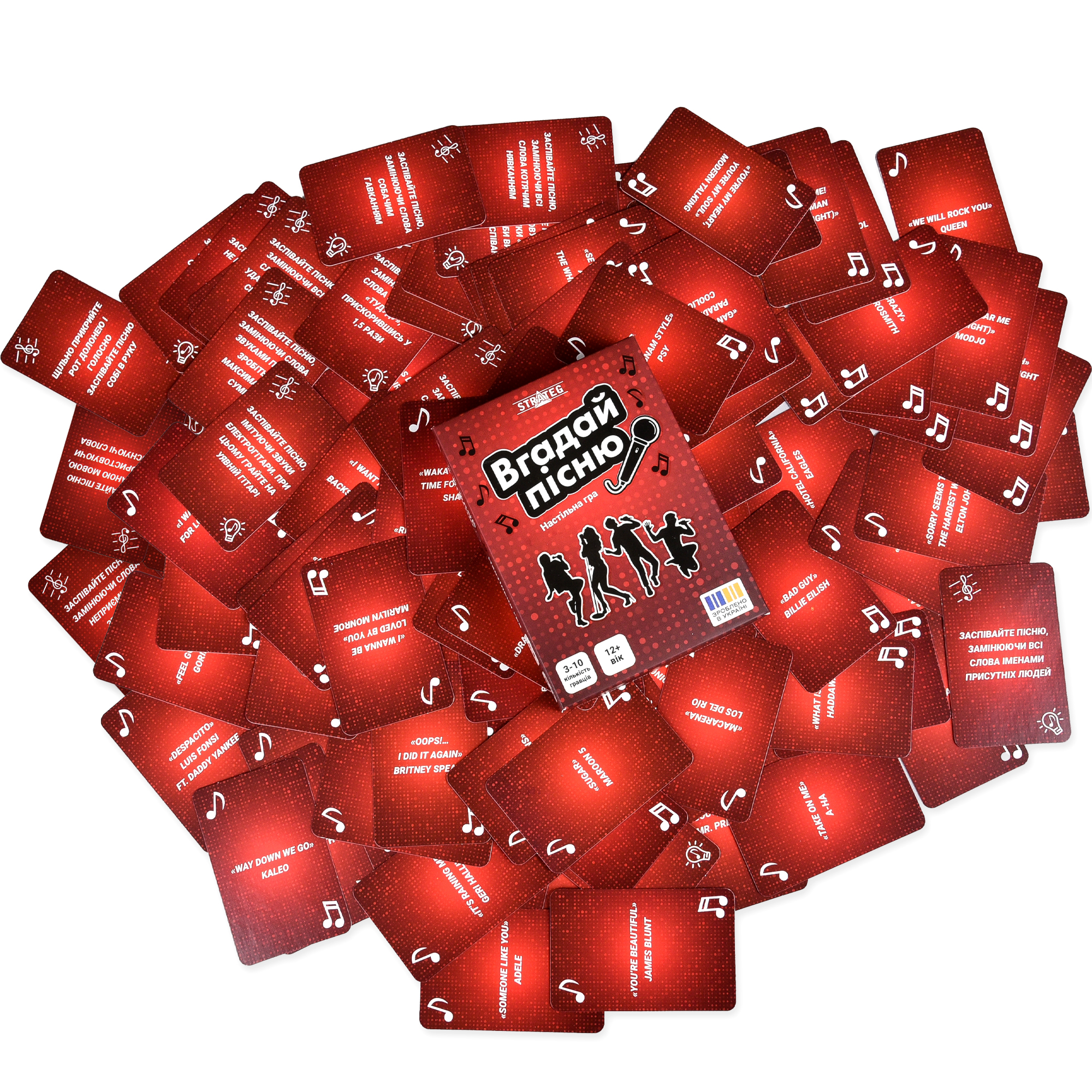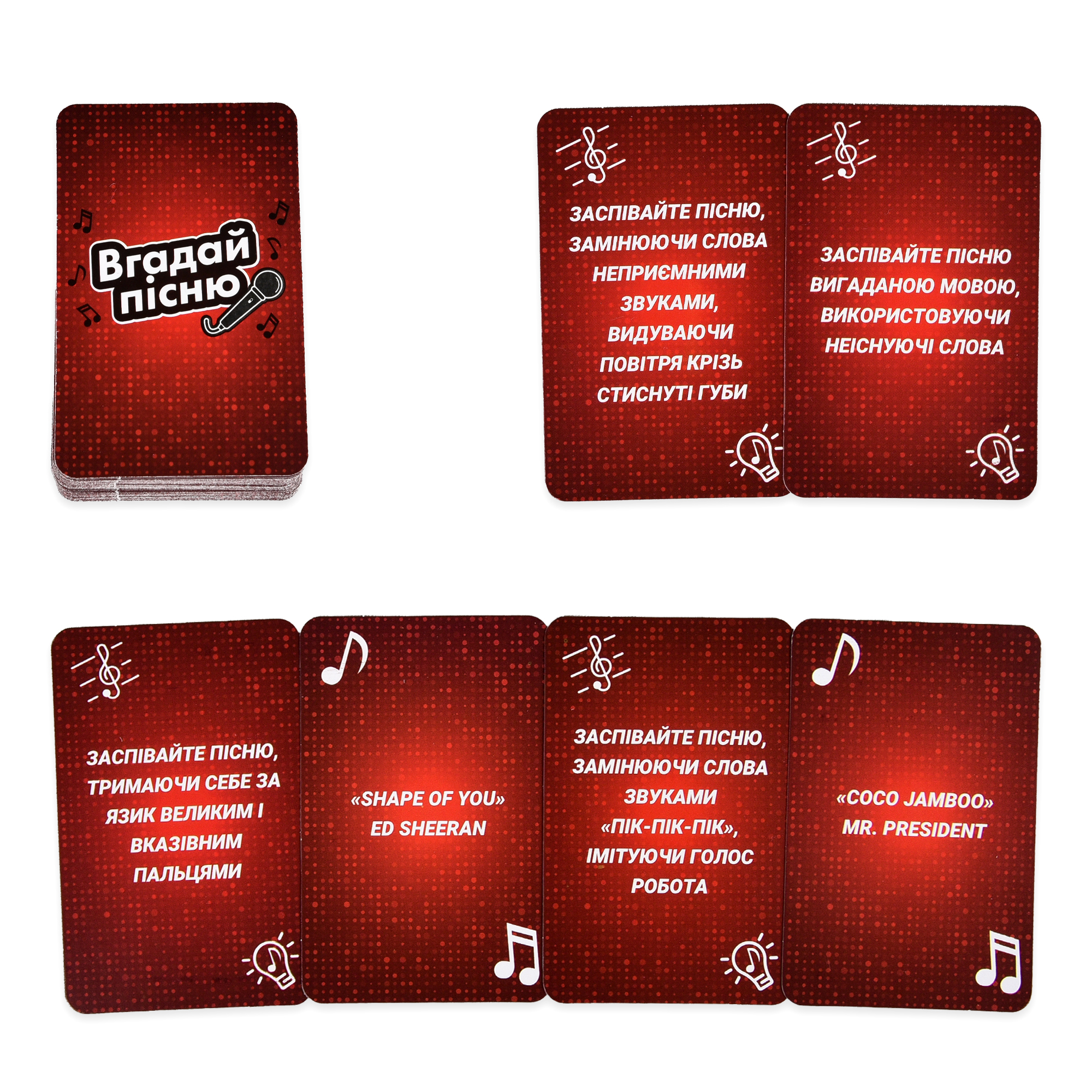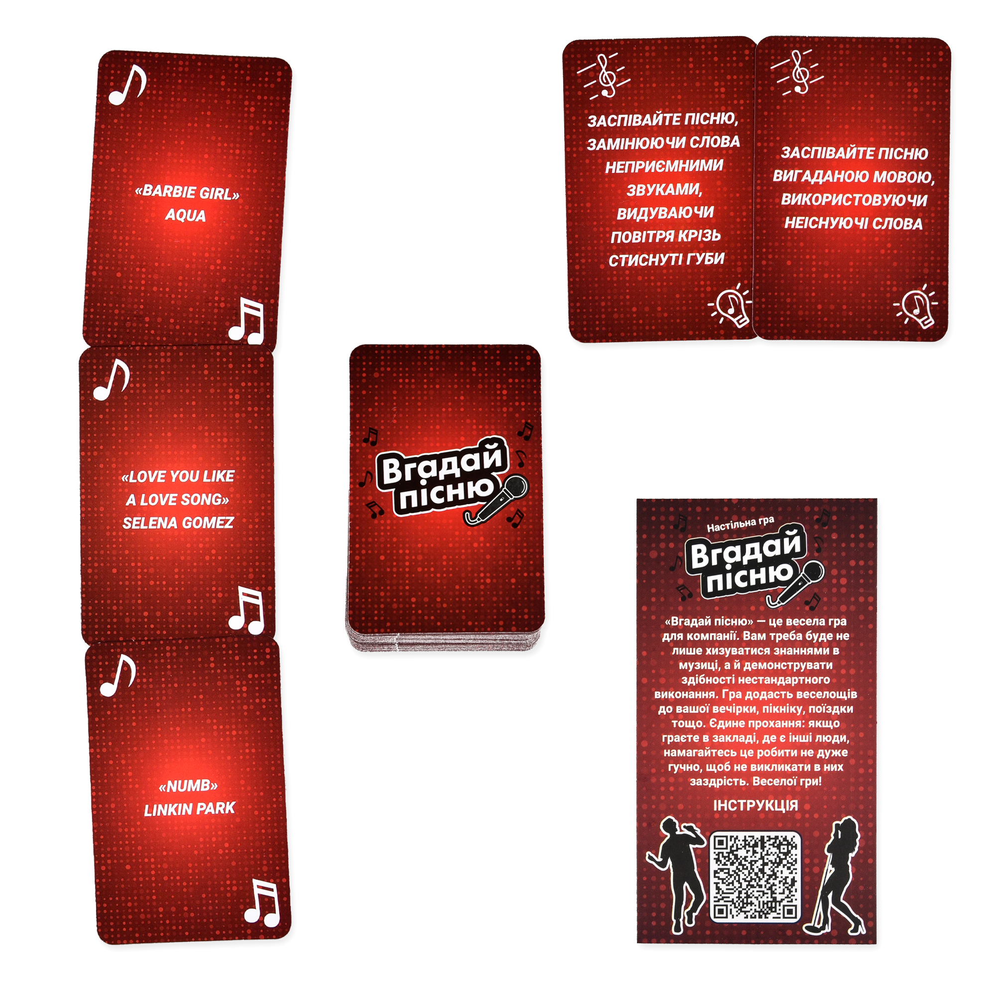 Настільна гра «Вгадай пісню» — це справжній вибух веселощів і музичного драйву! Один гравець отримує картку з назвою пісні та способом її виконання, а інші мають вгадати, що саме звучить. Співати доведеться по-різному — нявкаючи, бурмочучи чи навіть із закритим ротом!Кожен раунд — це порція сміху, креативу та гарного настрою. Ідеальний вибір для вечірок, сімейних зустрічей і компаній друзів. Попередження: надто весело — ризикуєте зірвати аплодисменти сусідів!Вік: від 12 років. Кількість гравців: 3–10.