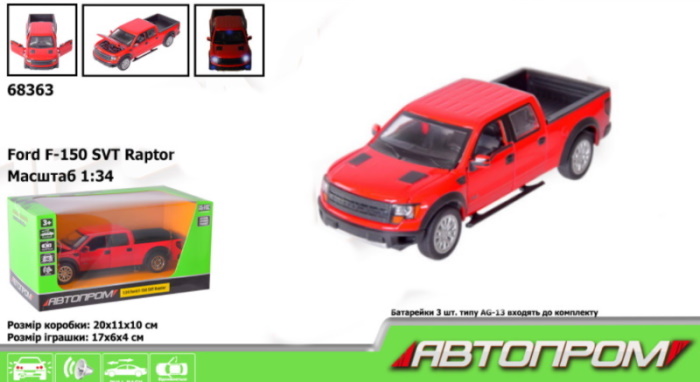 Машина мет. "АВТОПРОМ" 1:34 Ford F-150 SVT Raptor, бат., світ., звук, відчиняються двері, в кор. 20*11*10см (48шт/2)