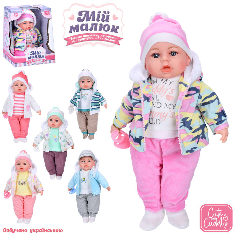 Пупс 44см, м'яконабивний, 6видів, муз.*звук(укр., пісня, вірш), пустишка, бат.(табл.), кор. 26*32,5*23см (18шт)